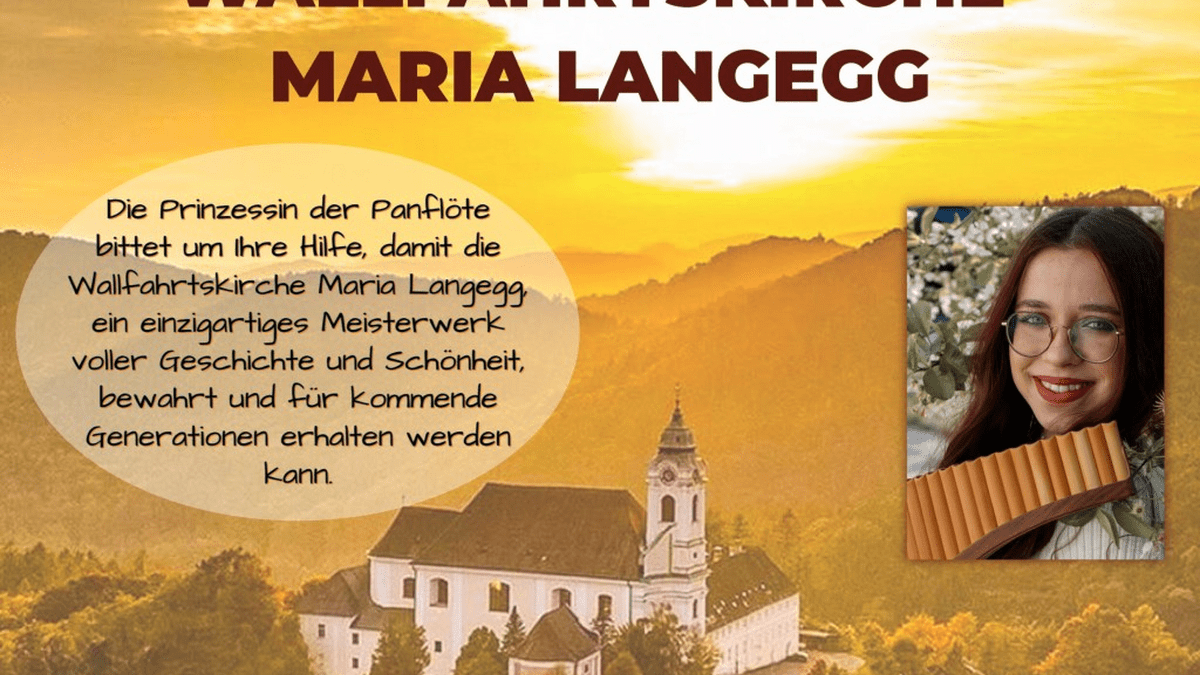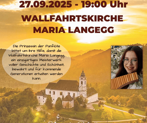 Am Samstag, dem 27. September 2025 um 19 Uhr, lädt die Panflötistin Natascha-Rafaella, zu einem einzigartigen Benefizkonzert in die Wallfahrtskirche Maria Langegg. Der Erlös dient der dringenden Sanierung dieses außergewöhnlichen Juwels im Dunkelsteinerwald.