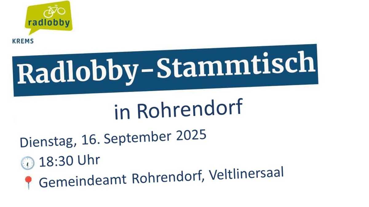 In Zusammenarbeit mit dem Umweltausschuss der Gemeinde Rohrendorf organsiert die Radlobby Krems einen Stammtisch im Veltlinersaal des Gemeinde- und Kulturzentrum Rohrendorf.
