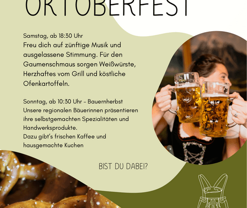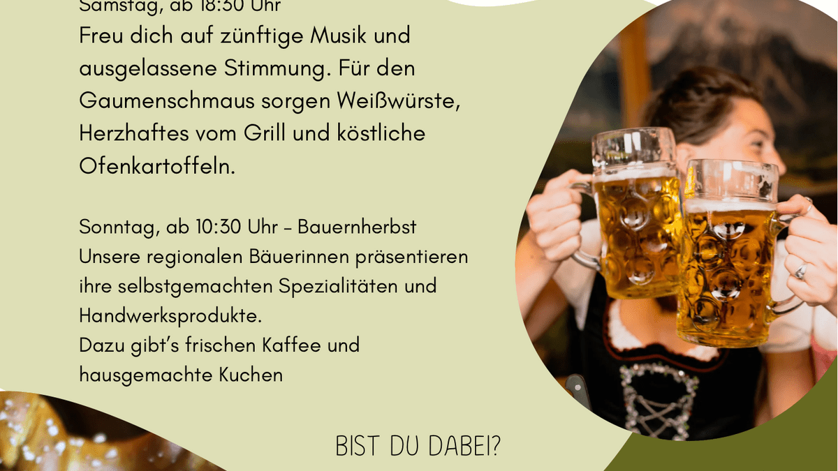 Ab 10:30 Uhr erwartet dich ein besonderer Bauernherbst-Sonntag, an dem Regionalität im Mittelpunkt steht: Unsere Bäuerinnen präsentieren köstliche Spezialitäten aus eigener Herstellung sowie feines Handwerk. Mit Herzhaftem vom Grill, köstlichen Ofenkartoffeln und anschließend frischem Kaffee und hausgemachten Kuchen wird der Tag zu einem genussvollen Beisammensein in herbstlicher Atmosphäre.