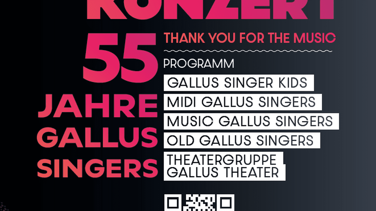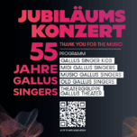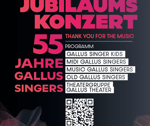 Die Gallus Singers feiern Ihr 55-jähriges Bestehen mit zwei großen Jubiläumskonzerten am 8. November 2025 in der Gusenhalle Gallneukirchen. Unter dem Titel „Thank you for the Music“ erwartet das Publikum ein musikalisches Feuerwerk mit allen Generationen des Chors.Die Konzerte finden um 15:30 Uhr und 19:30 Uhr statt. Mit dabei sind: die Gallus Singers Kids, Midi Gallus Singers, Music Gallus Singers, Old Gallus Singers sowie die Theatergruppe Gallus Singers mit Sketches.Für das leibliche Wohl ist ebenfalls gesorgt – Besucher dürfen sich auf Speisen und Getränke freuen.Tickets sind online erhältlich unter: www.ticketlotse.com/event/?d=1613 oder über den QR-CodeEin musikalisches Highlight, das man nicht verpassen sollte!