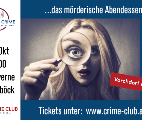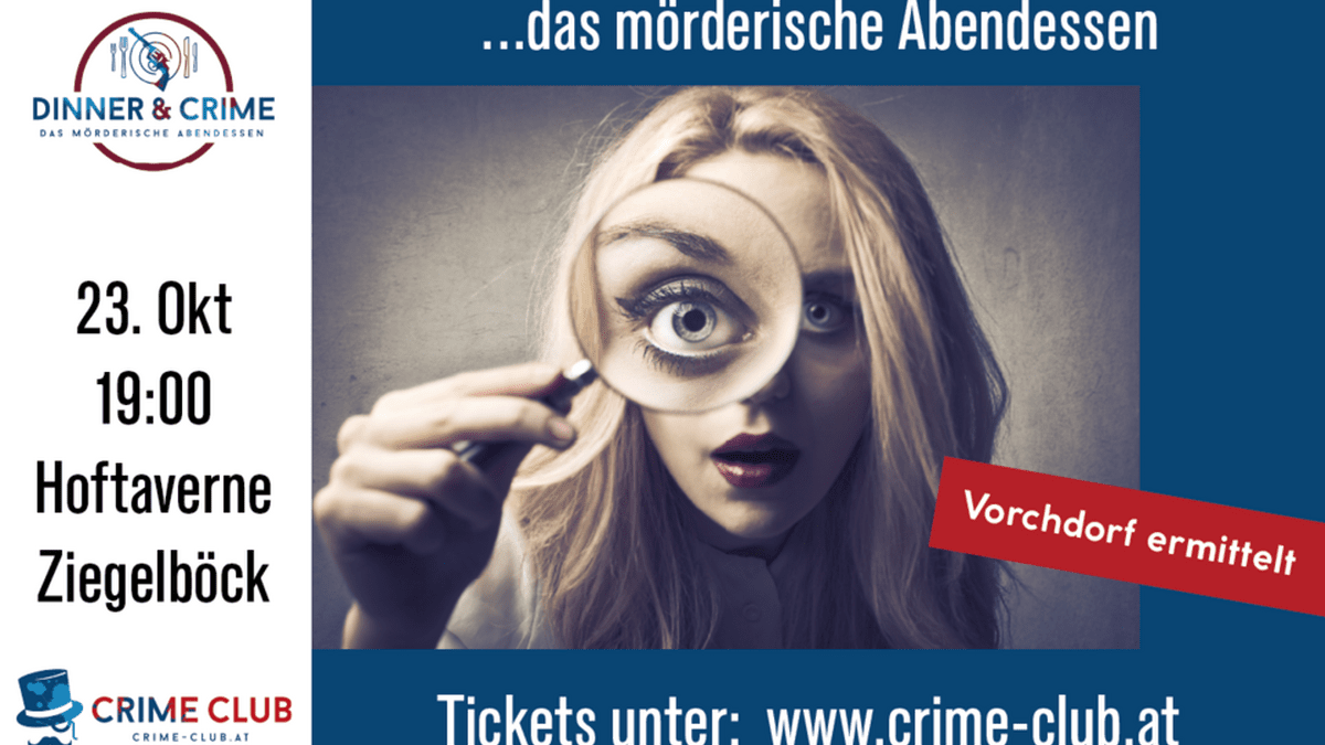 Der Bürgermeister übernimmt die Ermittlungen – und Sie sind mitten drin! Wann & Wo? Donnerstag, 23. Oktober 2025 Start: 19:00 Uhr Hoftaverne Ziegelböck, Vorchdorf Was Sie erwartet Ein spannender Krimi zum Mitraten Ein köstliches Mehrgänge-Menü Humor, Überraschungen & ein bisschen Nervenkitzel Egal ob zu zweit oder in einer Gruppe – der perfekte Abend für Krimi-Fans, Genießer und Neugierige! Tickets & Kontakt https://crime-club.at/termine-tickets E-Mail: reservierung@crime-club.at Tel.: 0800 88 02 88 (Mo-Fr, 9:30-13:30 Uhr)