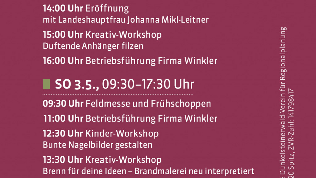 Die Region Dunkelsteinerwald lädt am Wochenende vom 2.–3. Mai 202 zur „Dunkelsteiner Erlebnisschau“ nach Rosenthal (Gemeinde Karlstetten) ein. Zwei Tage lang präsentieren mehr als 45 Betriebe aus der Region