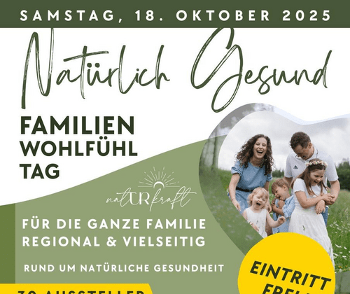 Am „Natürlich Gesund – Familien-Wohlfühltag“ erwartet die Besucher ein buntes Programm für alle Generationen. Regionale Aussteller präsentieren ihre Angebote rund um Gesundheit, Wohlbefinden und Natur. Inspirierende Vorträge und abwechslungsreiche Mitmach-Stationen laden ein, Neues kennenzulernen, auszuprobieren und Impulse für ein gesundes, erfülltes Leben mitzunehmen.