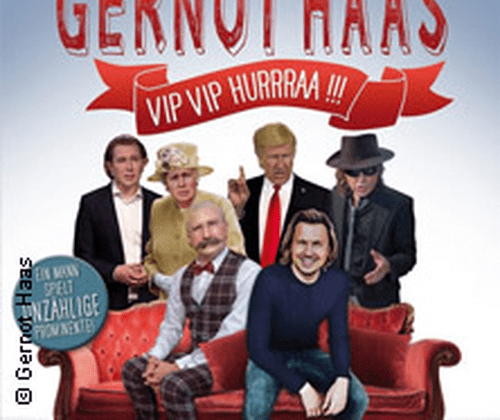 Zum 10-jährigen Bühnenjubiläum präsentiert "Österreichs Comedy-Chamäleon" (Zeitschrift GALA) und PULS4-Star (Des Traust Di Nie!, Sehr witzig!?) Gernot Haas sein neues Kabarettprogramm "Vip Vip Hurrraa !!!". Der "Meisterparodist" (Kleine Zeitung) schlüpft diesmal in die Rollen der beliebtesten Prominenten aus Sport, Politik und Showbusiness und überrascht sein Publikum mit einer umwerfend komischen Geschichte, bei der kein Auge trocken bleibt.