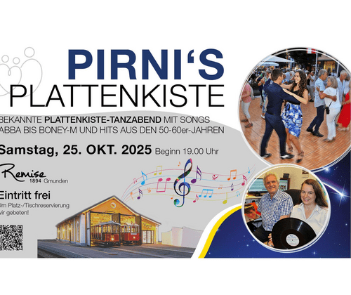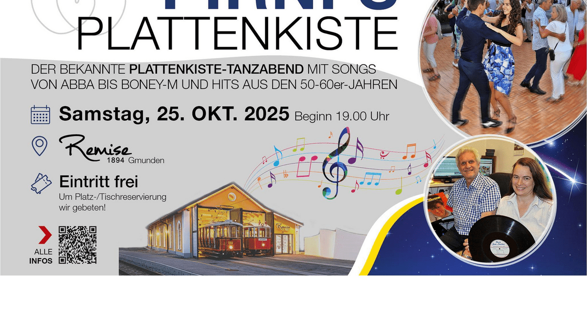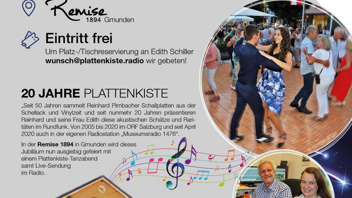 oder Buchung per Telefon unter: +43 664 7396 2755 „Seit 50 Jahren sammelt Reinhard Pirnbacher Schallplatten aus der Schellack und Vinylzeit und seit nunmehr 20 Jahren präsentieren Reinhard und seine Frau Edith diese akustischen Schätze und Raritäten im Rundfunk. Von 2005 bis 2020 im ORF Salzburg und seit April 2020 auch in der eigenen Radiostation „Museumsradio 1476“. In der Remise 1894 in Gmunden wird dieses Jubiläum nun ausgiebig gefeiert mit einem Plattenkiste-Tanzabend samt Live-Sendung im Radio.