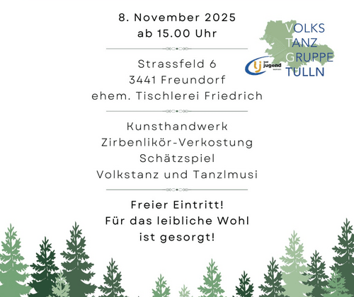 Auf Sie warten etliche Kunsthandwerksaussteller, ein Schätzspiel, eine Zirbenlikör-Verkostung, jede Menge Köstlichkeiten und vor allem: tänzerische Unterhaltung durch drei Volkstanzgruppen!
