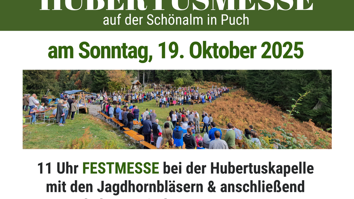 Die Pucher Jägerschaft veranstaltet jährlich am 3. Sonntag im Oktober die Hubertusmesse auf der Schönalm. Die Bergmesse wird feierlich von der Jagdhornbläsergruppe Puch-Oberalm umrahmt.