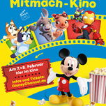 Was ist das Disney Channel Mitmachkino und was gibt es dieses Mal zu sehen?Kino bedeutet Licht aus, Ruhe und Stillsitzen?Nicht beim Disney Channel Mitmach-Kino! Hier dürfen Kinder eine Stunde lang lautstark mitsingen, tanzen, klatschen und rätseln – eben alles, nur nicht leise sein!Auf der großen Leinwand führt Micky Maus als animierter Gastgeber die Kinobesucher durch das kunterbunte Programm, das auf die kleinsten Zuschauer im Vorschulalter ausgerichtet ist und ca. 60 Minuten kindgerechtes Mitmach-Kino bietet: