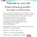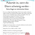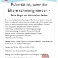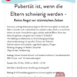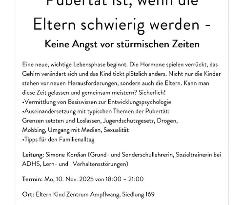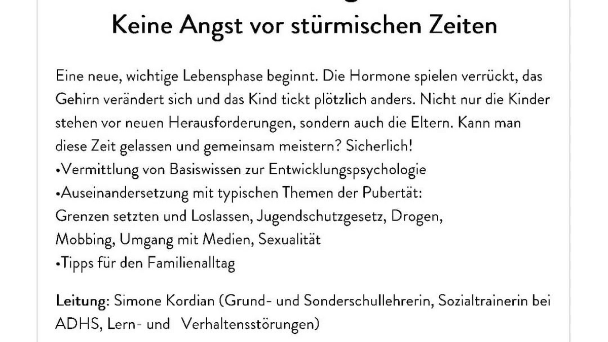 Vermittlung von Basiswissen zur EntwicklungspsychologieAuseinandersetzung mit typischen Themen der Pubertät:Grenzen setzen und Loslassen, Jugendschutzgesetz, Drogen, Mobbing, Umgang mit Medien, SexualitätTipps für den FamilienalltagLeitung: Simone Kordian (Grund- und Sonderschullehrerin, Sozialtrainerin bei ADHS, Lern- und Verhaltensstörungen)