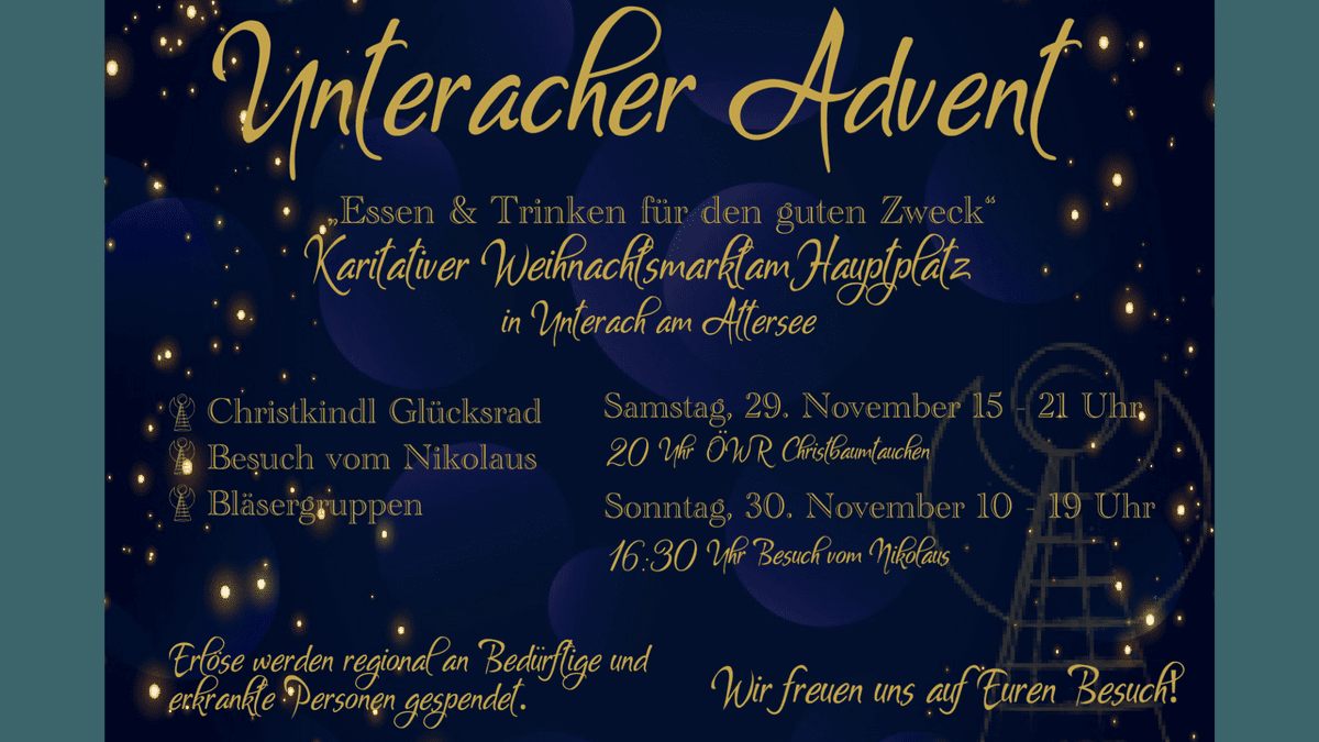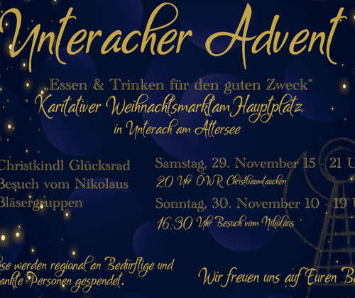 Unteracher Christkindlmarkt Karitativer Weihnachtsmarkt in Unterach am ersten Adventwochenende 2025. Samstag, 29. November 2025 von 15:00 bis 21:00 Uhr * 20 Uhr ÖWR Christbaumtauchen Sonntag, 30. November 2025 von 10:00 bis 19:00 Uhr * 16:30 Uhr Besuch vom Nikolaus "Essen & Trinken für den guten Zweck " Christkindl Glücksrad Besuch vom Nikolaus Bläsergruppen Erlöse werden regional an Bedürftige und erkrankte Personen gespendet.
