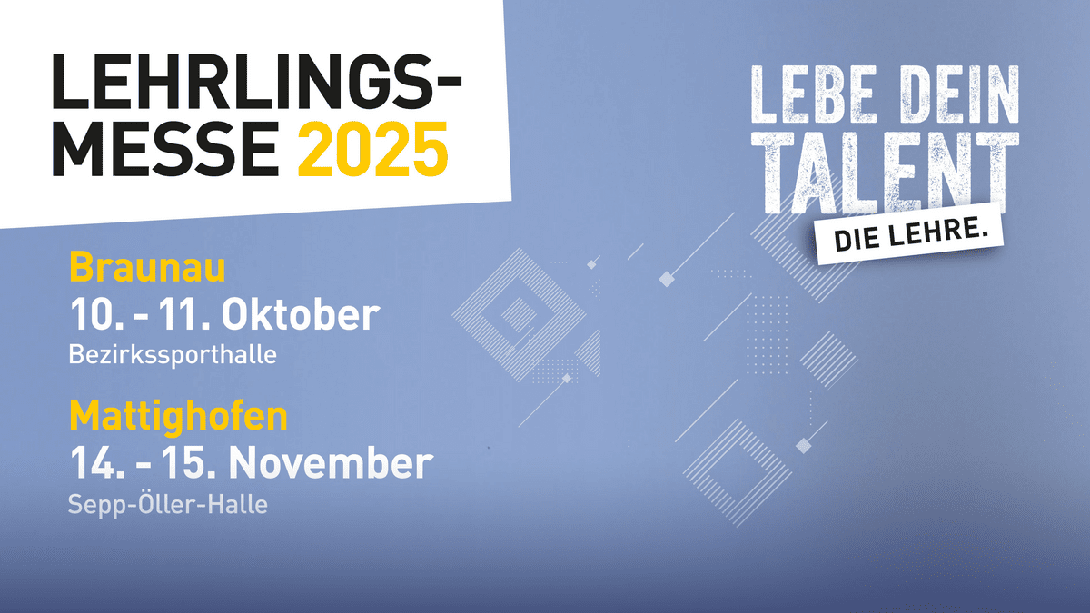 Auf den Lehrlingsmessen warten auf dich über 70 namenhafte Aussteller aus der Nähe, über 70 verschiedene Lehrberufe, vieles zum Erleben und Ausprobieren, viele Infos zum Thema „Lehre“ allgemein, Gratis Bewerbungsfoto vom Profi, Vortrag über „Die richtige Berufswahl“ und Gratis-Popcorn Besuche die Lehrlingsmesse! Es ist der erste Schritt in deine erfolgreiche berufliche Karriere! Mehr Infos Braunau: 10. bis 11. Oktober, Bezirkssporthalle Mattighofen: 14. bis 15. November, Sepp Öller-Sporthalle Freitag 13–18 Uhr Samstag 9–13 Uhr