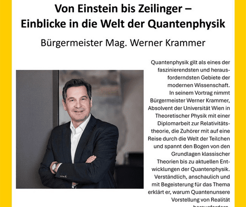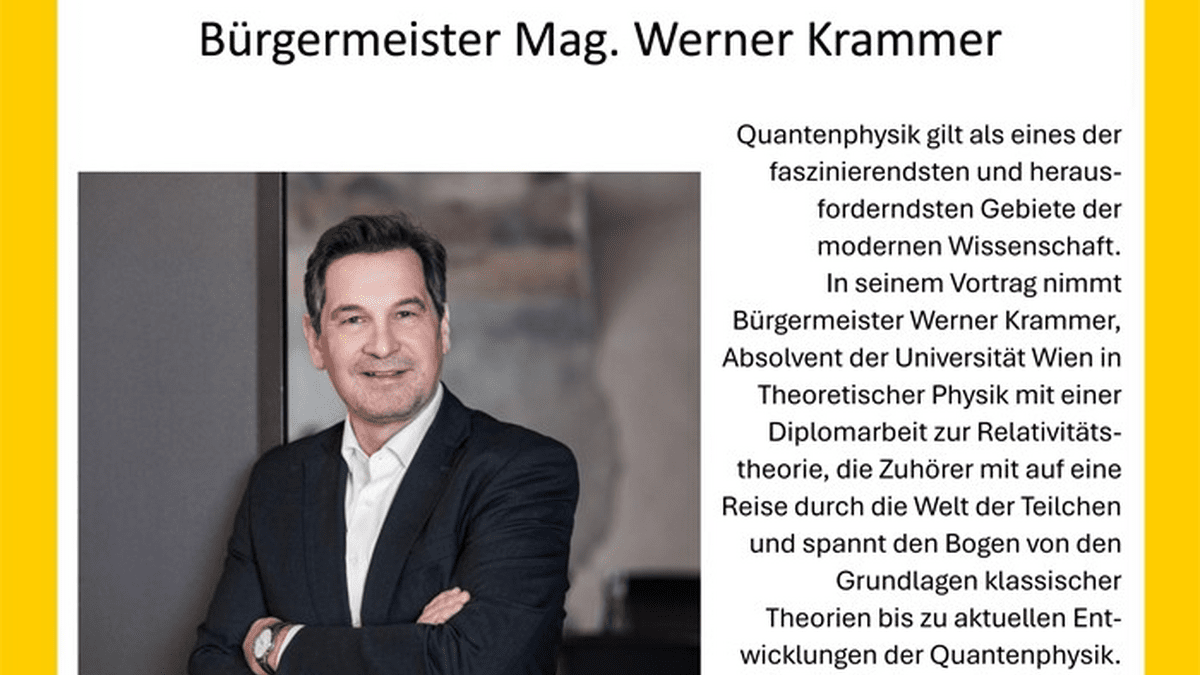 Quantenphysik gilt als eines der faszinierendsten und zugleich herausforderndsten Gebiete der modernen Wissenschaft. In einem fundierten Vortrag nimmt Bürgermeister Werner Krammer, Absolvent der Universität Wien im Fach Theoretische Physik, mit auf eine Reise durch die Welt der kleinsten Teilchen.