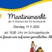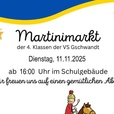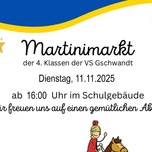 Die vierten Klassen der Musikvoksschule Gschwandt laden zum MartinimarktTürkränze Kekse & Kuchen diverses Handarbeiten Spielzeugflohmarkt Tombola Für das leibliche Wohl sorgen die Eltern der 4. Klassen mit selbstgemachten KöstlichkeitenWir freuen uns auf einen gemütlichen Abend!