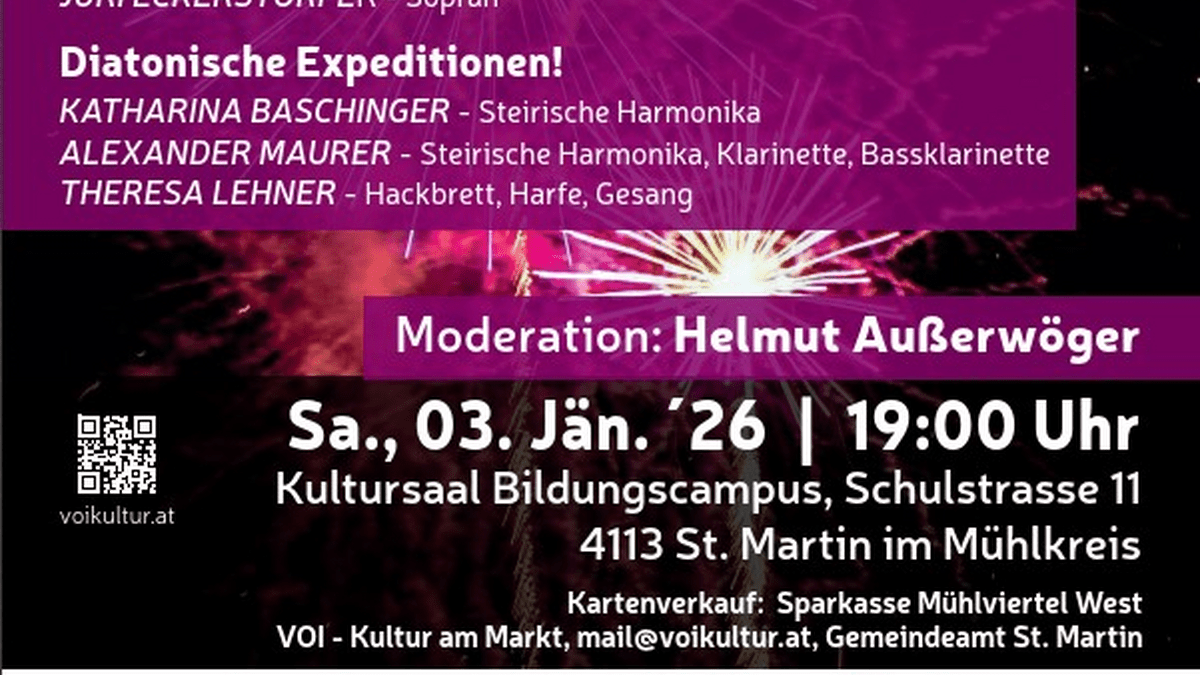Zum bereits fünften Mal lädt das Ensemble des Nordwald Kammerorchesters zu einem festlichen Jahresauftakt. Unter der Leitung von Thomas Eckerstorfer und mit der Sopranistin Juri Eckerstorfer erwartet das Publikum ein abwechslungsreiches Programm voller musikalischer Höhepunkte.Ein besonderes Highlight sind die „Diatonischen Expeditionen“ mit:Katharina Baschinger – Steirische HarmonikaAlexander Maurer – Steirische Harmonika, Klarinette, BassklarinetteTheresa Lehner – Hackbrett, Harfe, GesangDurch den Abend führt in bewährter Weise Helmut Außerwöger mit einer charmanten und unterhaltsamen Moderation.Freuen Sie sich auf ein Neujahrskonzert, das Schwung, Freude und musikalische Vielfalt in den Jahresbeginn trägt – ganz nach dem Motto: „Ohne Musik wär’s alles nix.“