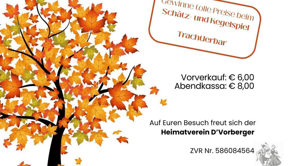 Gewinne tolle Preise beim Schätz- und Kegelspiel.Ob Jung oder Alt - der Erntetanz ist für alle, die den Volkstanz, Gemeinschaft und gute Stimmung lieben. Kommen Sie vorbe, bringen Sie Freunde mit und tanzen Sie mit uns in den Herbst!Vorverkauf: € 6,00 / Abendkasse € 8,00Auf euren Besuch freut sich der Heimatverein D´Vorberger!