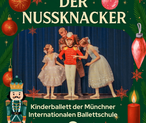 Die Münchner Kinderballettschule lädt zum Ballett Der Nussknacker ein, bei dem sowohl erwachsene Künstler als auch Kinder, Schüler der Ballettschule, tanzen. Die Hauptrollen werden von Solistinnen und Solisten führender europäischer Theater getanzt.Am Weihnachtsabend geschieht ein Wunder: Die kleine Clara trifft den mutigen Nussknacker, der sie vor dem Mäusekönig rettet. Gemeinsam begeben sie sich auf eine zauberhafte Reise, in der in der Heiligen Nacht Träume und geheimste Wünsche wahr werden.