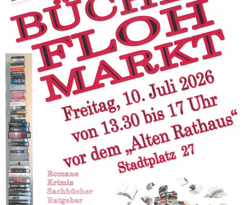 Bücherflohmarkt vor dem Alten Rathaus am Stadtplatz 27von 13.30 bis 17.00 UhrGerne können während des Jahres Bücher für den Bücherflohmarkt während unserer Öffnungszeiten gebracht werden.Aber bitte keine zu alten Bücher und keine "Dachbodenauflösungen" - danke für das Verständnis!