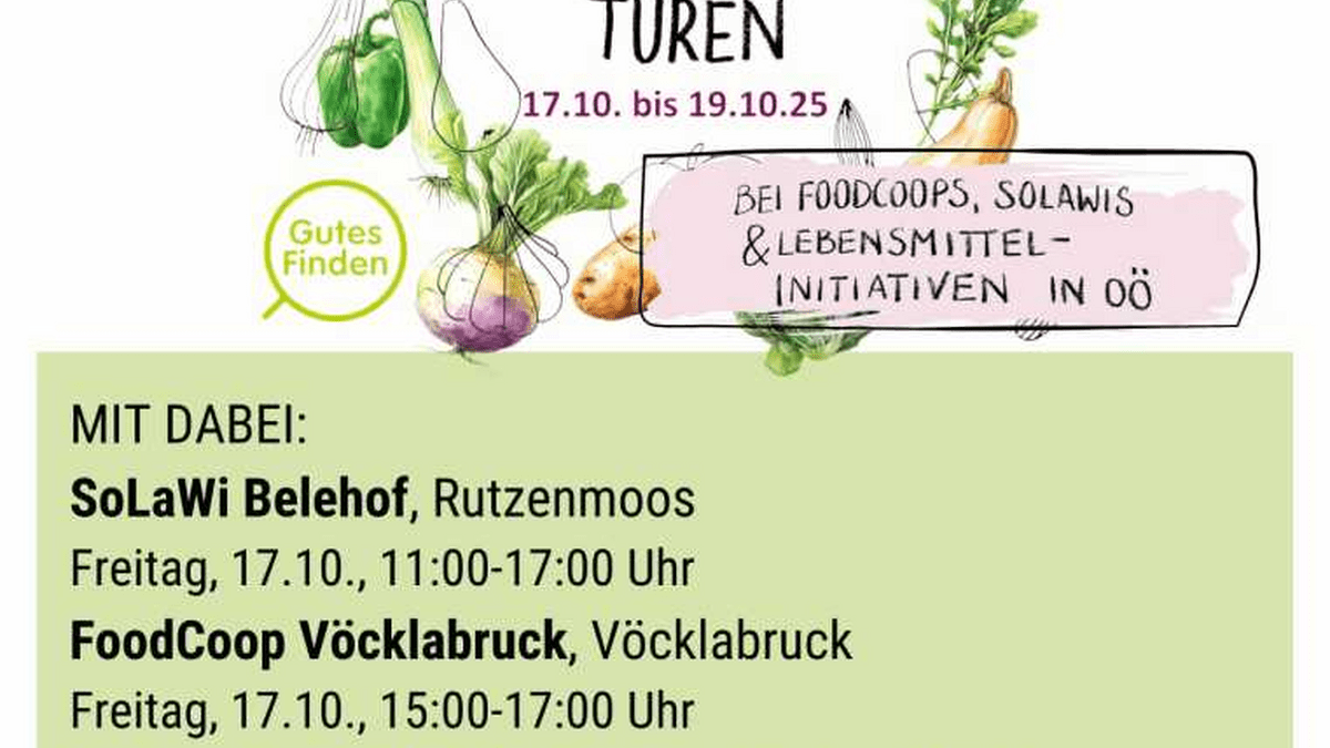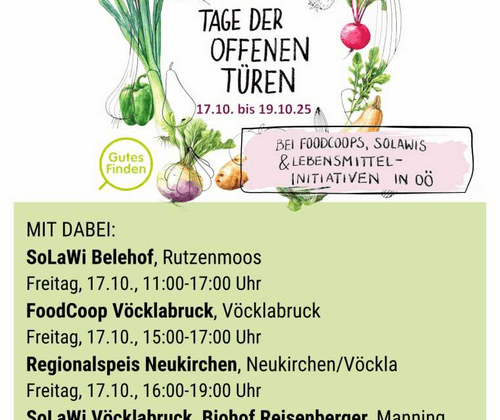 Am Freitag, den 17. Oktober 2025, laden wir von 15:00 bis 17:00 Uhr herzlich zum Tag der offenen Tür der FoodCoop Vöcklabruck ein.Kommt vorbei, schaut euch an, wie bei uns bestellt, sortiert und abgeholt wird, und lernt die Gesichter hinter der Gemeinschaft kennen.Für alle, die Lust auf Genuss haben: Wir bereiten einen kleinen Abholschmaus vor – einige unserer Produkte könnt ihr direkt verkosten.Wir freuen uns auf euch!