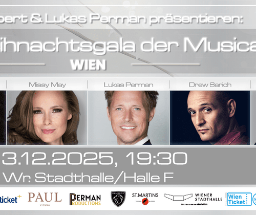 Am 13.12.2025 findet um 19.30 das Konzert von Mark Seibert & Lukas Perman - „Die große Weihnachtsgala der Musicalstars“ nach dem großen Erfolg der vergangenen Jahre wieder in der Wiener Stadthalle, Halle F statt! Feiern Sie Weihnachten mit den beliebten Stars der großen Musicalbühnen und lassen Sie sich bei diesem einzigartigen Galakonzert - kurz vor Heilig Abend - in festliche Stimmung bringen! Die bezaubernden Künstlerinnen Ana Milva Gomes, Missy May und Maya Hakvoort sowie die charmanten Künstler Lukas Perman, Drew Sarich und Mark Seibert singen für Sie besinnliche Songs und die schönsten weihnachtlichen Melodien! Durch den Abend führen die Initiatoren und Produzenten des Konzerts - Mark Seibert & Lukas Perman - in gewohnt freundschaftlicher Manier. Musikalisch verwöhnt werden Sie an dem Abend von einer einzigartigen Band mit den besten Musikern des Landes unter der Leitung von Christian Frank!