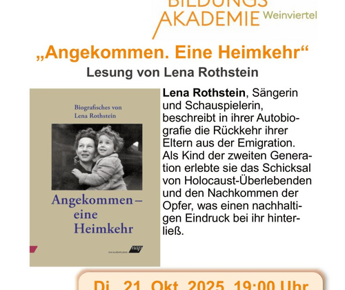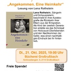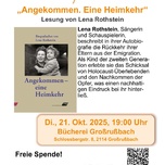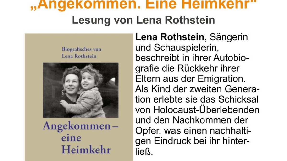 Die Sängerin und Schauspielerin Lena Rothstein schildert in ihrer Autobiografie, anlässlich der Heimkehr ihrer Eltern aus der Emigration, wie aus ihrer damaligen Perspektive als Kind der zweiten Generation das Schicksal von Holocaust-Überlebenden und Nachkommen der Opfer aus ihrer Familie, für sie ein nachhaltiger Eindruck entstand. In ihrem Buch erzählt Rothstein außerdem von ihrem künstlerischen Weg zur jüdischen Kultur, von den zahlreichen Konzerten, Tourneen und den gemeinsamen vergnüglichen und auch schmerzlichen Erfahrungen mit Mitarbeitern und Managern, und man erfährt wie ihre eigenen Lieder, Texte und Produktionen mit Musikern aus den verschiedensten Sparten entstanden. Viele interessante Details aus ihrem Leben wird uns Lena Rothstein gerne in ihrer Lesung anhand ihres Buches in der Bücherei verraten. Man darf gespannt sein!