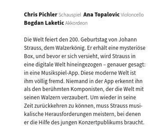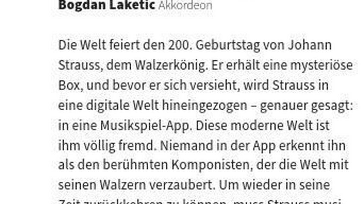Die Welt feiert den 200. Geburtstag von Johann Strauss, dem Walzerkönig. Er erhält eine mysteriöse Box, und bevor er sich versieht, wird Strauss in eine digitale Welt hineingezogen – genauer gesagt: in eine Musikspiel-App. Diese moderne Welt ist ihm völlig fremd. Niemand in der App erkennt ihn als den berühmten Komponisten, der die Welt mit seinen Walzern verzaubert. Um wieder in seine Zeit zurückkehren zu können, muss Strauss musi- kalische Herausforderungen meistern, bei denen er die Hilfe des jungen Konzertpublikums braucht. Werke von Johann Strauss Vater und Johann Strauss Sohn 8:50 Uhr: empfohlen für die 1. bis 4. Schulstufe