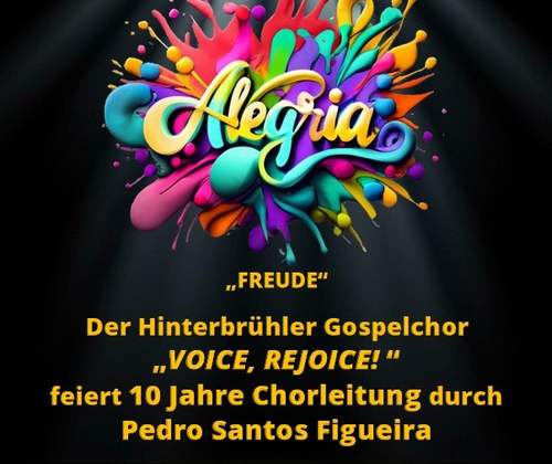 Der Gospelchor „VOICE, REJOICE!“ feiert 10 Jahre Chorleitung durch Pedro Santos Figueira und gestaltet ein Konzert, bei dem auch musikalische Highlights dieser gemeinsamen Zeit dargeboten werden.