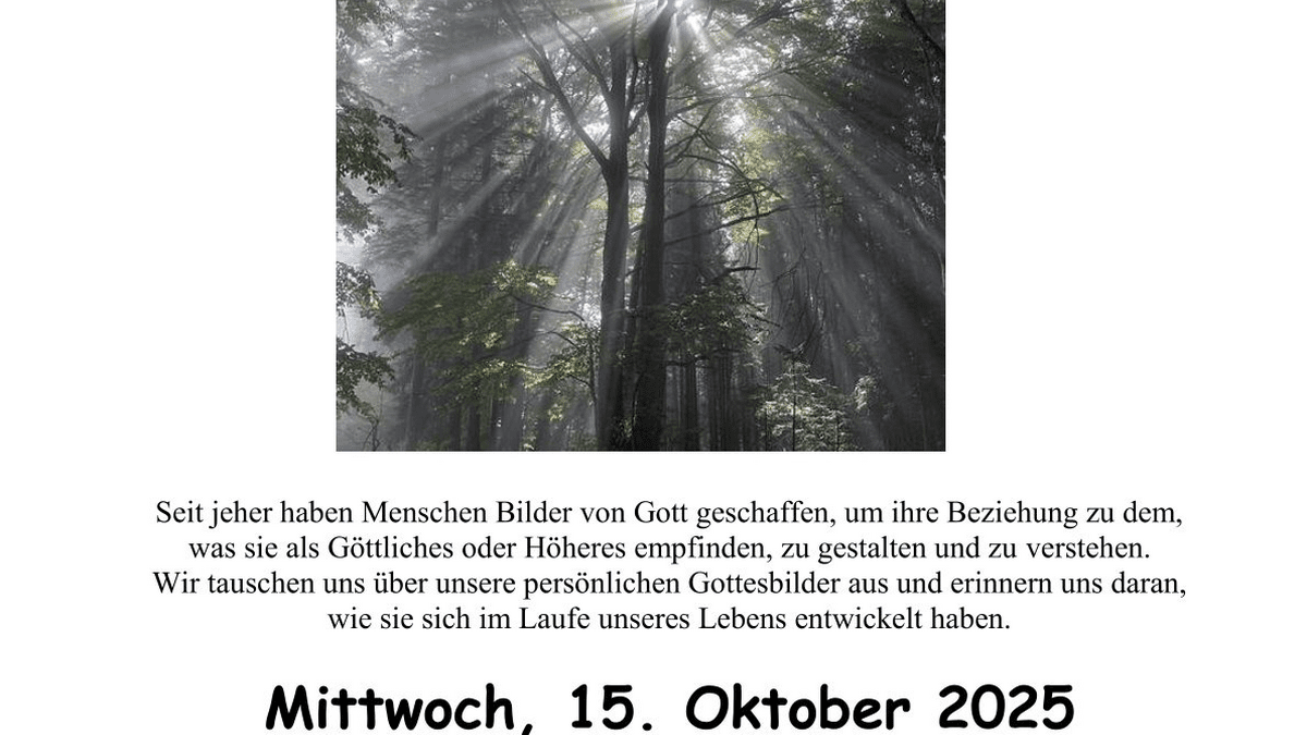 Seit jeher haben Menschen Bilder von Gott geschaffen, um ihre Beziehung zu dem, was sie als Göttliches oder Höheres empfinden, zu gestalten und zu verstehen. Wir tauschen uns über unsere persönlichen Gottesbilder aus und erinnern uns daran, wie sie sich im LAufe unseres Lebens entwickelt haben.