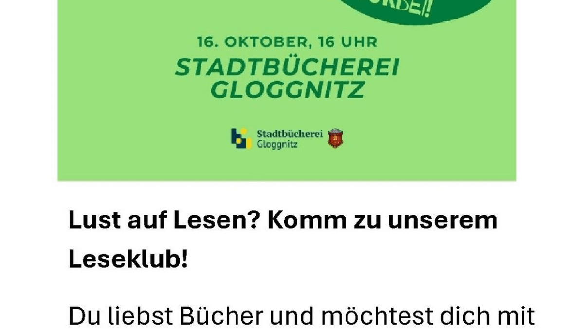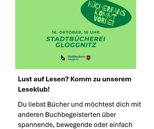 Der Leseklub trifft sich zum ersten Mal am 16.10.2025 um 16 Uhr in der Stadtbücherei Gloggnitz zu einer gemütlichen Runde mit Kaffee und Kuchen. Egal ob Roman, Krimi oder Klassiker – bring deine Leseleidenschaft mit!