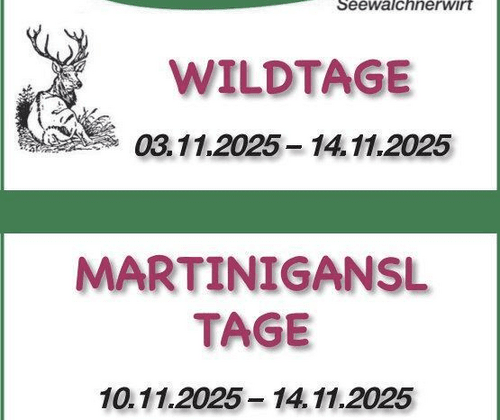 Regionale Spezialitäten genießen! Im Gasthof zur Seeburg - "Seewalchnerwirt" erwarten Sie auch heuer wieder besondere kulinarische Highlights. Freuen Sie sich auf unsere herbstlichen Genusswochen: Vom 03. bis 14. November 2025 laden wir herzlich zu unseren „Wildtagen“ ein – mit feinen Wildgerichten und regionalen Schmankerln. Ein besonderes Highlight sind unsere Martinigansltage von 10. bis 14. November 2025 – nur auf Vorbestellung! Reservierungen nehmen wir gerne unter 06212 / 2385 oder per E-Mail an info@gasthof-seeburg.at entgegen. Wir freuen uns auf Ihren Besuch!