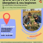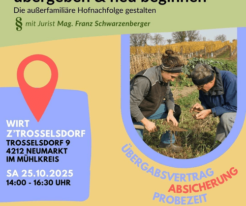 „Lebenswerke übergeben & neu beginnen“ beim Wirt z’Trosselsdorf (OÖ) Außerfamiliäre Hofübergabe - Informationsveranstaltung & Austausch Samstag, 25. Oktober 2025 | 14:00 - 16:30 Trosselsdorf 9, 4212 Trosselsdorf Begrenzte Plätze - Bitte um rechtzeitige Anmeldung (siehe unten). Inhalt & Programm: Infoabend zur außerfamiliären Hofübergabe mit Mag. Franz Schwarzenberger (LK OÖ), Vorstellung des Vereins Perspektive Landwirtschaft sowie rechtliche Einblicke, Austausch und Kennenlernen für Hofsuchende, Hofübergebende und Interessierte . Eine Hofnachfolge in der Familie ist nicht immer möglich – viele Menschen, von weichenden Erbinnen bis zu Quereinsteigerinnen mit Erfahrung, möchten jedoch einen Betrieb weiterführen. Die Plattform www.perspektive-landwirtschaft.at unterstützt bei der außerfamiliären Hofnachfolge und stellt am Infoabend ihre Angebote sowie zentrale rechtliche und zwischenmenschliche Aspekte vor. Das Lebenswerk außerfamiliär zu übergeben bietet Chancen für die Übergebenden sowie Hofsuchenden. Anmeldung: Begrenzte Plätze - Wir bitten um rechtzeitige Anmeldung bis spätestens MI 22. Oktober 2025 über das Anmeldeformular: https://www.perspektive-landwirtschaft.at/civicrm/event/register/?reset=1&id=11 oder per Email an info@perspektive-landwirtschaft.at oder telefonisch unter: +43 660 / 11 33 211 Teilnahmegebühr: 20 € pro Person / 15€ pro Person für Perspektive Landwirtschaft Mitglieder / 15 € für Personen, die aufgrund ihrer finanziellen Situation Unterstützung benötigen Gerne stellen wir eine Teilnahmebestätigung aus. Wir freuen uns auf DEIN Kommen! Das Team von Perspektive Landwirtschaft