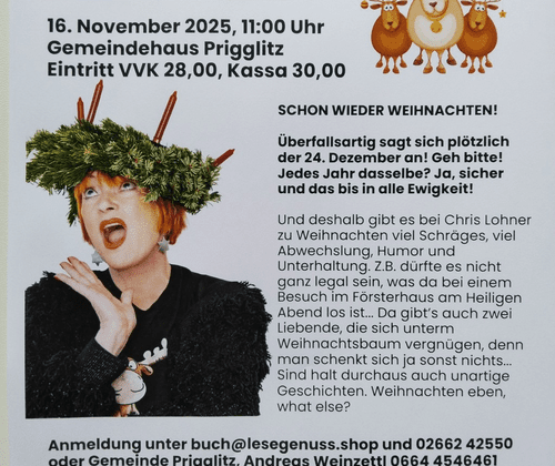 Anmeldung unter buch@lesegenuss.shop und 02662 42550 oder Gemeinde Prigglitz 0664 4546461