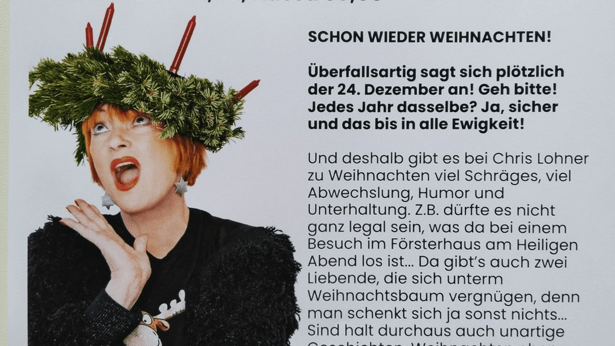 Und deshalb gibt es bei Chris Lohner zu Weihnachten viel Schräges, viel Abwechslung, Humor und Unterhaltung. Zum Beispiel dürfte es nicht ganz legal sein, was da bei einem Besuch im Försterhaus am heiligen Abend los ist... Da gibt’s auch zwei Liebende, die sich unterm Weihnachtsbaum vergnügen, denn man schenkt sich ja sonst nichts... Sind halt durchaus auch unartige Geschichten. Weihnachten eben, what else?