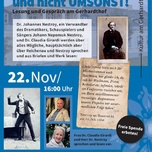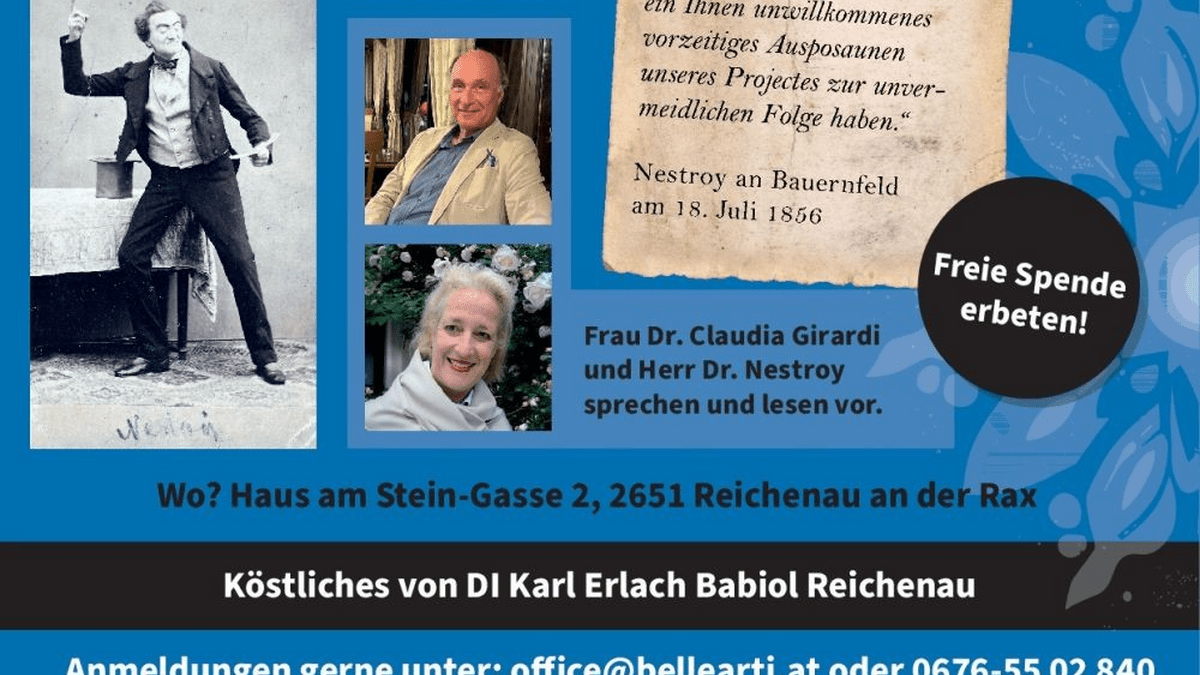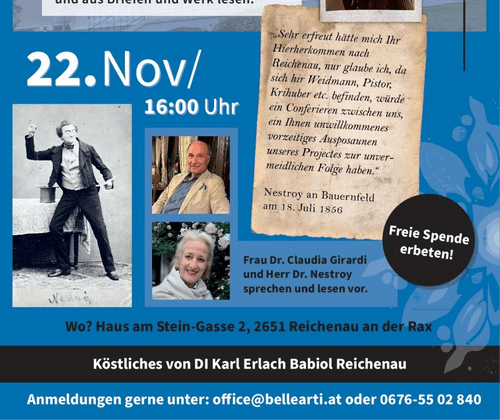 „Apropos, wo ist denn der Herr da, der alte Spektakelmacher, hin?“ Dr. Johannes Nestroy, ein Verwandter des großen österreichischen Dramatikers, Schauspielers und Sängers Johann Nepomuk Nestroy, und Dr. Claudia Girardi werden über alles Mögliche, hauptsächlich aber über Reichenau und Nestroy sprechen und aus Briefen und Werk lesen. Der Kaffeesieder Gschlader aus Nestroys Posse „Umsonst“ könnt‘ gut ein Reichenauer gewesen sein: „Ohne Theater können wir nicht sein. So klein unsre Stadt ist, so haben wir doch einen unsinnigen Kunstsinn.“