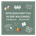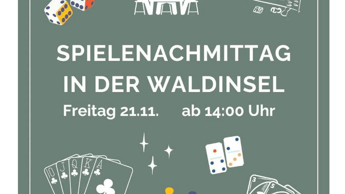 Spielenachmittag in der Waldinsel Könnt ihr euch noch erinnern? Vor einem Jahr haben wir schon gemeinsam viele gemütliche Stunden beim Spielen verbracht – jetzt geht’s endlich wieder los. In der kühlen Jahreszeit darf’s auch in und um uns herum wieder etwas ruhiger werden – perfekt also für einen entspannten Nachmittag mit Familie & Freunden bei uns in der Waldinsel. Ob Tarock, Uno, Mensch ärgere dich nicht, Schach oder euer ganz eigenes Lieblingsspiel – alles ist willkommen! Wir sorgen für das leibliche Wohl, ihr bringt gute Laune und Spielfreude mit. Reservierungen nehmen wir gerne entgegen!