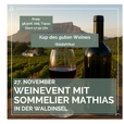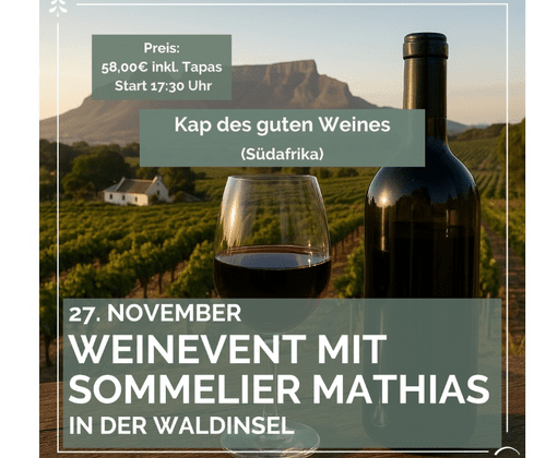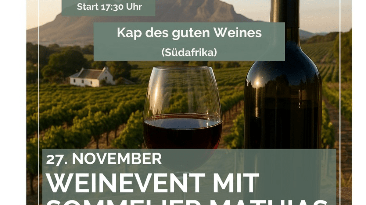 Weinevent im November – Kap des guten Weines Am 27. November entführt euch Sommelier Mathias ans Kap der Guten Hoffnung . Freut euch auf ausdrucksstarke südafrikanische Weine, begleitet von fein abgestimmten Tapas aus unserer Küche. Erlebt einen genussvollen Abend voller Geschichten, Aromen und südafrikanischem Flair – sichert euch jetzt euren Platz !