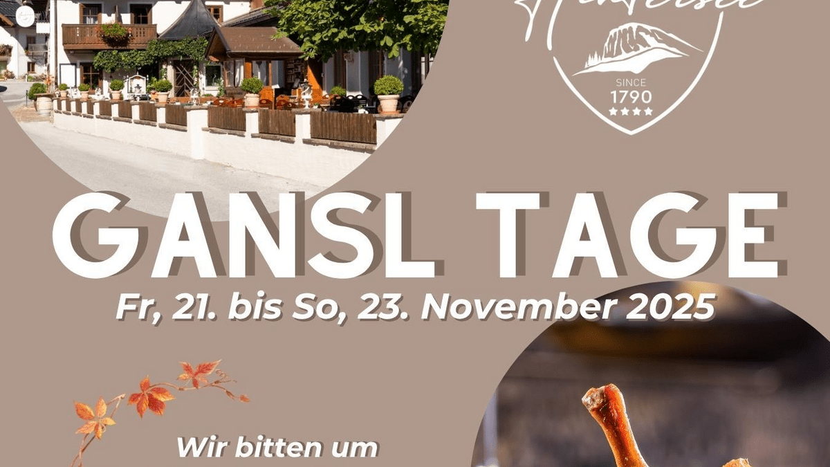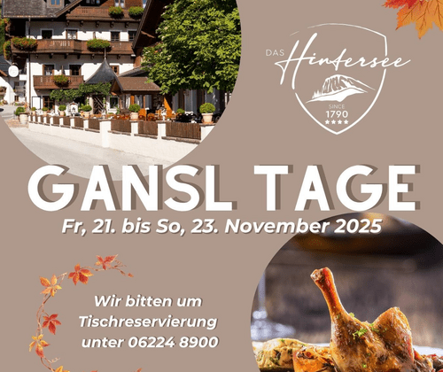 Traditionelle GANSL TAGE im Restaurant DAS Hintersee von Freitag, 21. bis Sonntag, 23. November 2025 Genießt unsere feinen, klassisch zubereiteten Gansl-Spezialitäten – knusprig, aromatisch und einfach ein Genuss!Dazu servieren wir herbstliche Beilagen und erlesene Weine aus Österreich.Bitte um rechtzeitige Tischreservierung!