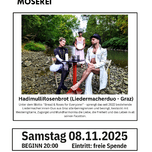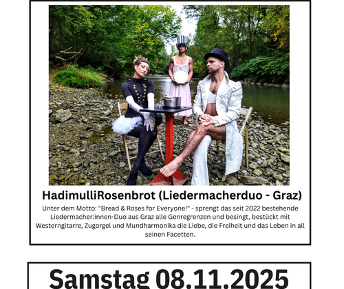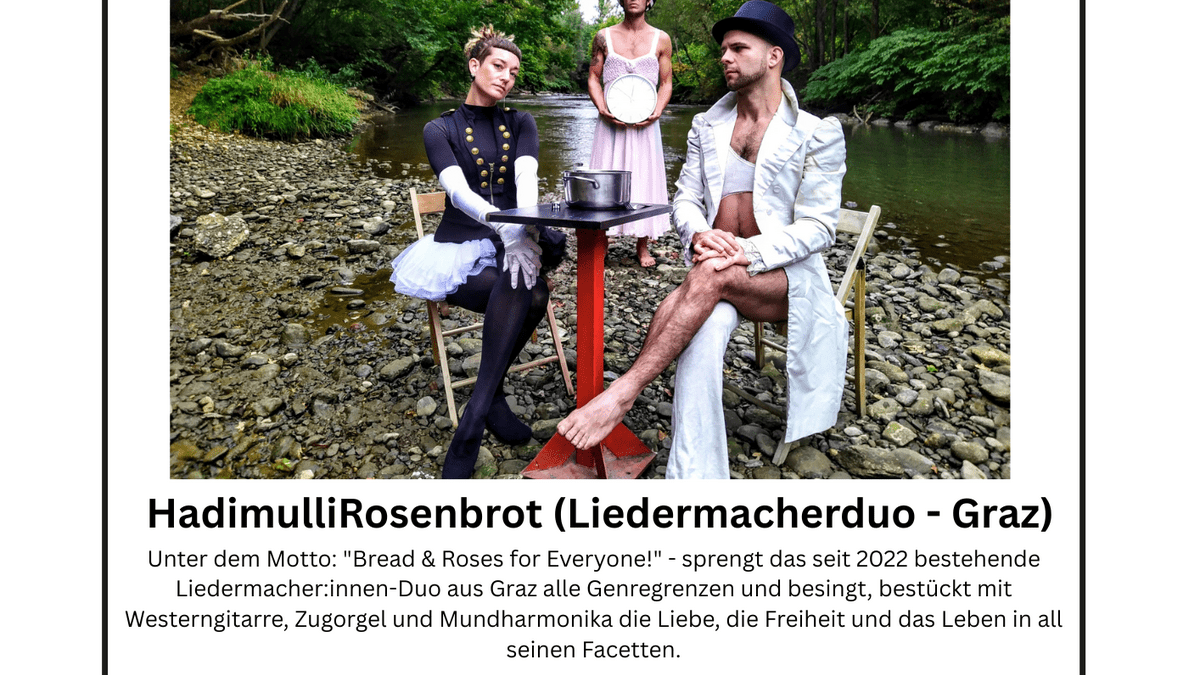 Unter dem Motto "Bread & Roses for Everyyone!" - sprengt das seit 2022 bestehende Liedermacher:innen-Duo aus Graz alle Genregrenzen und besingt, bestückt mit Westerngitarre, Zugorgel und Mundharmonika die Liebe, die freiheit und das Leben in all seinen Facetten. Beginn: 20:00 Uhr