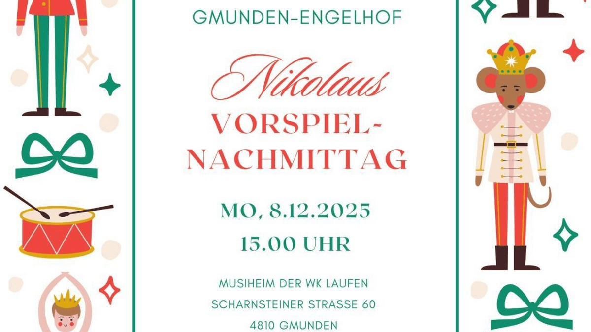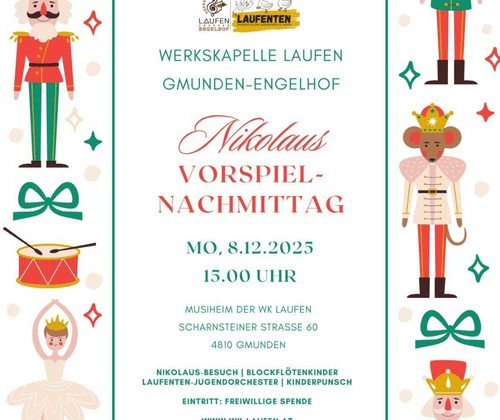 Die Werkskapelle ladet am Feiertag, Montag, 8. Dezember 2025 ab 15 Uhr zum Nikolaus-Nachmittag ins Vereinsheim. Die Kinder des Laufenten-Jugendclubs – Blockflötenkinder und Mitglieder des Jugendorchesters – sorgen mit weihnachtlichen Klängen für festliche Stimmung. Auch der Nikolaus hat seinen Besuch angekündigt und freut sich auf viele strahlende Gesichter und Kinderpunsch.