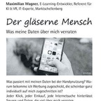 VORTRAG UND GESPRÄCH Maximilian Wagner, E-Learning-Entwickler, Referent für KI & VR, IT-Experte, Marktschellenberg Der gläserne Mensch Was meine Daten über mich verraten Was passiert mit meinen Daten bei der Handynutzung? Warum bekomme ich Werbung zugeschickt, die scheinbar ganz individuell auf
