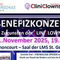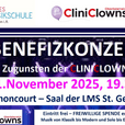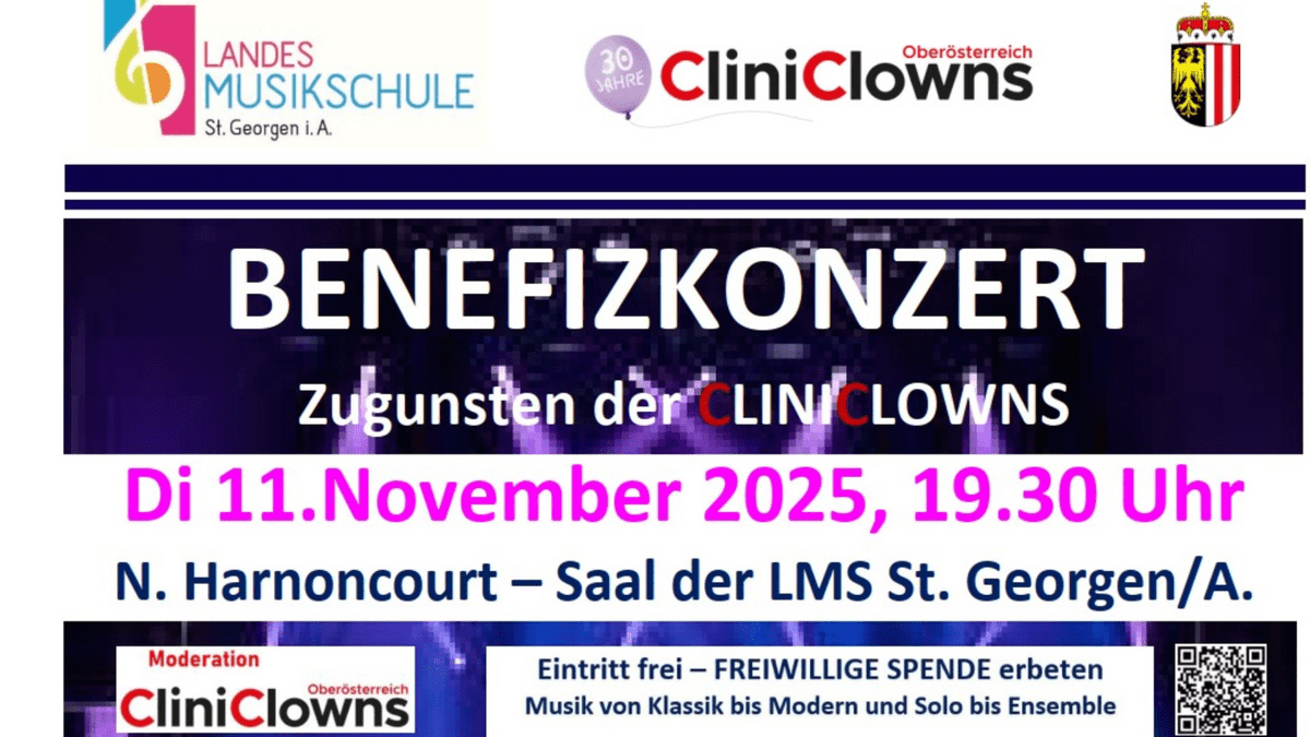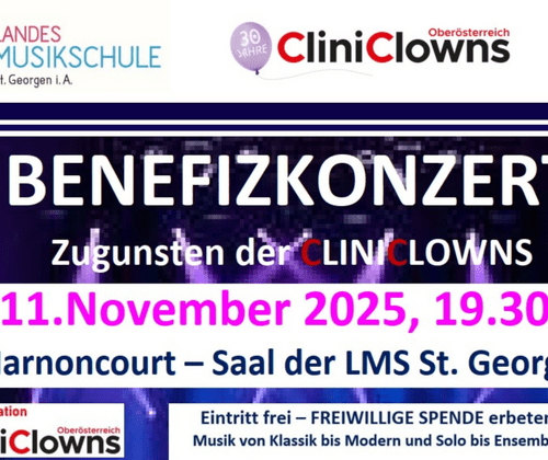 BENEFIZKONZERT zugunsten der CLINICLOWNS Di 11.November 2025, 19.30 Uhr Nikolaus Harnoncourt – Saal der LMS St. Georgen/A. Moderation: CliniClowns Eintritt frei –freiwillige Spenden Am Di 11.November 2025, 19.30 Uhr veranstaltet die LMS St. Georgen im Attergau ein „BENEFIZKONZERT zugunsten der CLINICLOWNS“! Dies ist der Abschluss einer Konzertreihe der OÖ. Landesmusikschulen mit den CliniClowns, die in Oberösterreich ihren 30 Geburtstag feiern. Das Besondere ist: Es musizieren Personen aus den Gesundheits- und Pflegeeinrichtungen des Bezirks, von der Ärztin bis zum Krankenpfleger und von der Diätologin bis zum Apotheker mit Unterstützung der LMS St. Georgen/A.! Dementsprechend wird ein buntes Programm im N. Harnoncourt – Saal der Landesmusikschule St. Georgen/A. geboten, Musik von Klassik bis Modern und Solo bis Ensemble. Die Moderation übernehmen die CliniClowns! Der Eintritt ist frei – es werden natürlich freiwillige Spenden erbeten