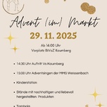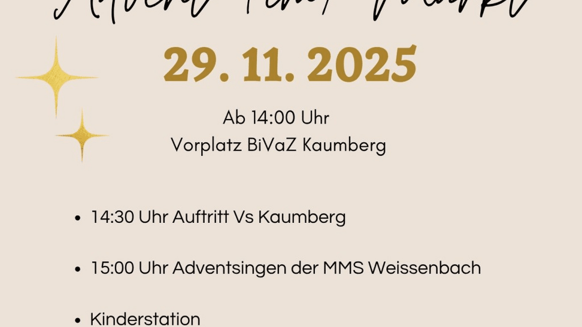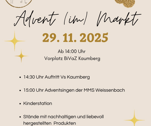 Advent (im) Markt ist ein stimmungsvoller Adventmarkt, veranstaltet vom Verein groß & KLEIN, mit einem bunten Angebot für alle Generationen. Dieser findet am 29.11.2025 am Vorplatz des Bildungs- und Veranstaltungszentrums in Kaumberg statt und beginnt um 14 Uhr. Zu den Highlights zählen das Adventsingen der Schülerinnen und Schüler der Volksschule Kaumberg sowie der MMS Weissenbach, eine Kinderbastelstation sowie eine Tombola mit vielen bunten Preisen. Stände mit nachhaltigen und liebevoll hergestellten Produkten bilden natürlich das Herzstück, für das leibliche Wohl ist selbstverständlich bestens gesorgt.