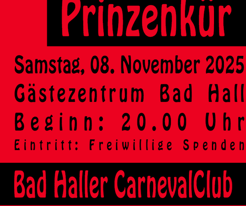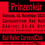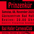 Liebe Freunde des BHCC,die neue Faschingssaison steht vor der Tür und es haben bereits die Vorbereitungen dafür begonnen.Die Prinzenkür findet am Samstag, 8. November 2025 im Gästezentrum Bad Hall statt,Beginn: 20.00 Uhr.Es ist jeder herzlich willkommen bei der Inthronisation unseres neuen Prinzenpaares dabei zu sein. Der neue Gardemarsch der Jugendgarde, der Showtanz unserer Prinzengarde, einige Musikstücke der Gugga-Musi und Tanzmusik unseres DJ's machen die Prinzenkür zu einem abwechslungsreichen und stimmungsvollen Erlebnis, das garantiert für gute Laune und beste Unterhaltung sorgt.