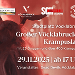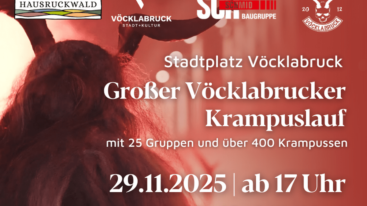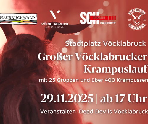 Großer Vöcklabrucker Krampuslauf 2025 Am 29.11.2025 wird es wieder schaurig am Vöcklabrucker Stadtplatz. Der große Vöcklabrucker Krampuslauf kehrt zurück und mit ihm 25 Gruppen und über 400 Krampusse. Ab 17 Uhr tummeln sich schon zahlreiche Schauergestalten am Stadtplatz, ab 18 Uhr beginnt der Hauptlauf. Bei freiem Eintritt können Sie sich wieder das Fürchten beibringen lassen. Veranstalter: Dead Devils Vöcklabruck Der Vöcklapunsch ist regulär von 16-22 Uhr geöffnet.