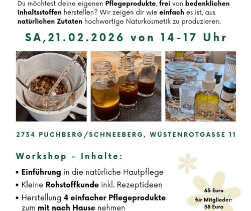 Du möchtest deine eigenen Pflegeprodukte, frei von bedenklichen Inhaltsstoffen herstellen? In diesem Workshop wird dir gezeigt, wie du aus natürlichen Zutaten hochwertige Naturkosmetik produzieren kannst.