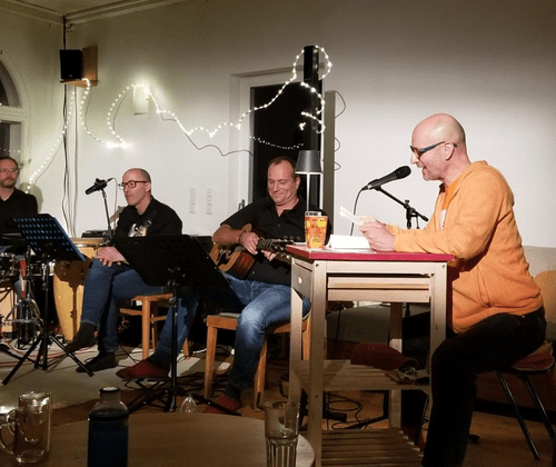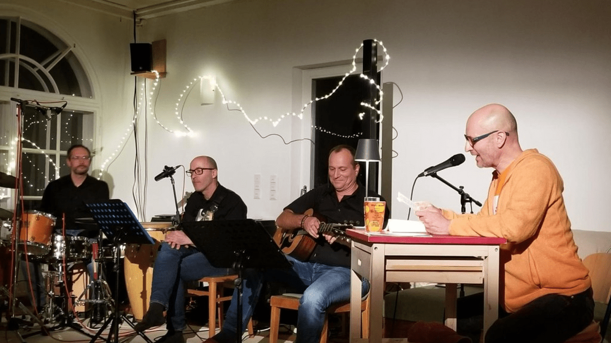 Es erwartet dich ein äußerst unterhaltsamer und vergnüglicher Abend! Die mitreißenden Nummern der Band wechseln sich ab mit heiter-schrägen Geschichten, die der Autor selbst liest.