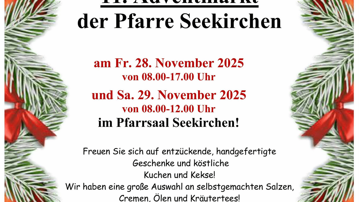 Herzliche Einladung zum 11. Adventmarkt der Pfarre Seekirchen am Fr, 29. November von 08-17 Uhr & am Sa, 30. November von 08-12 Uhr Freuen Sie sich auf: handgefertigte Geschenke Köstliche Kuchen & Kekse Große Auswahl an selbstgemachten Salzen, Cremen, Ölen und Kräutertees Wunderschöne Adventkränze und Weihnachtsgestecke Der Reinerlös vom Adventmarkt kommt bedürftigen Seekirchner Familien zugute.