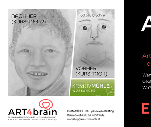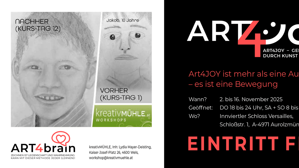 Die Ausstellung „Art4JOY – Generationen durch Kunst verbunden“ präsentiert Werke von über 40 Teilnehmer:innen zwischen 9 und 80 Jahren, die in nur wenigen Wochen realistische Porträts, Stillleben und Landschaften geschaffen haben – mithilfe der neurowissenschaftlich fundierten Art4BRAIN-Methode. Entwickelt von der oberösterreichischen Künstlerin Lydia Mayer-Deisting, die mit Multipler Sklerose lebt, verbindet diese Methode Wahrnehmung, Denken und Kreativität zu einem intensiven Erlebnis. Besucher:innen erleben beeindruckende Vorher-Nachher-Arbeiten, Live-Zeichnen und Gespräche mit den Künstler:innen. Ein Teil der Verkaufserlöse unterstützt die Mukoviszidose-Hilfe Oberösterreich.Vernissage: 7. November, 14 Uhr | Eintritt frei