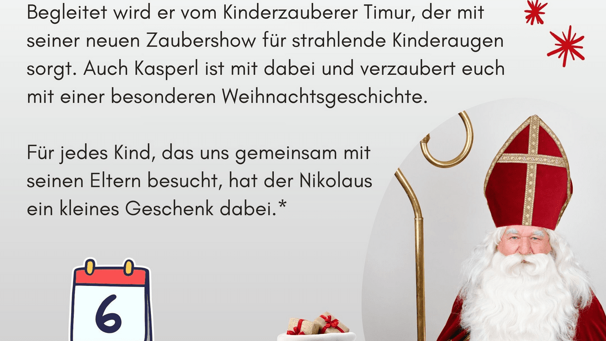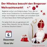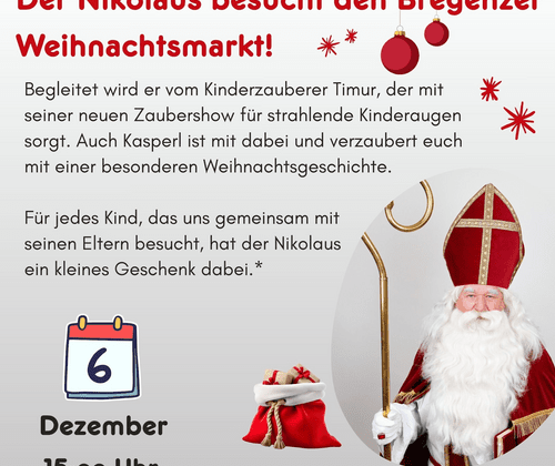 Der Nikolaus besucht den Bregenzer Weihnachtsmarkt!Begleitet wird er vom Kinderzauberer Timur, der mit seiner neuen Zaubershow für strahlende Kinderaugen sorgt. Auch Kasperl ist mit dabei und verzaubert euch mit einer besonderen Weihnachtsgeschichte.Für jedes Kind, das uns gemeinsam mit seinen Eltern besucht, hat der Nikolaus ein kleines Geschenk dabei.*