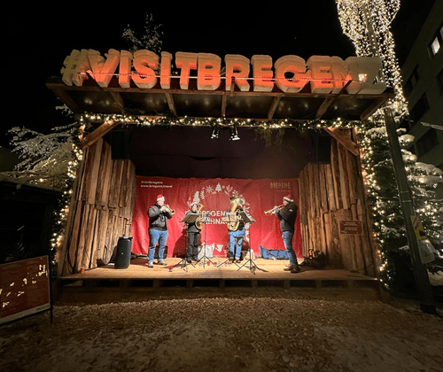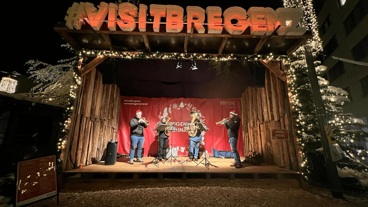 Das Zimtsternquartett - ein Ensemble aus Musikern mit Leidenschaft - sorgt mit festlicher Blasmusik für weihnachtliche Stimmung auf dem Bregenzer Weihnachtsmarkt.