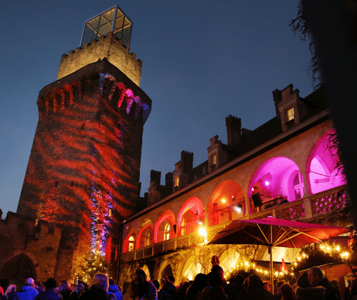 Ein eindrucksvolles Lichterspiel taucht das historische Schloss in festlichen Glanz. Mehr als 50 Aussteller präsentieren bodenständiges Handwerk und liebevolle Bastelkunst und in der Schwarzen Kuchl verströmt der Goldhauben- und Trachtenverein mit seinen köstlichen Schlossmäusen Nostalgie und Gemütlichkeit, während für Kinder eine Bastelstube in der Weihnachtswerkstatt geöffnet ist.
